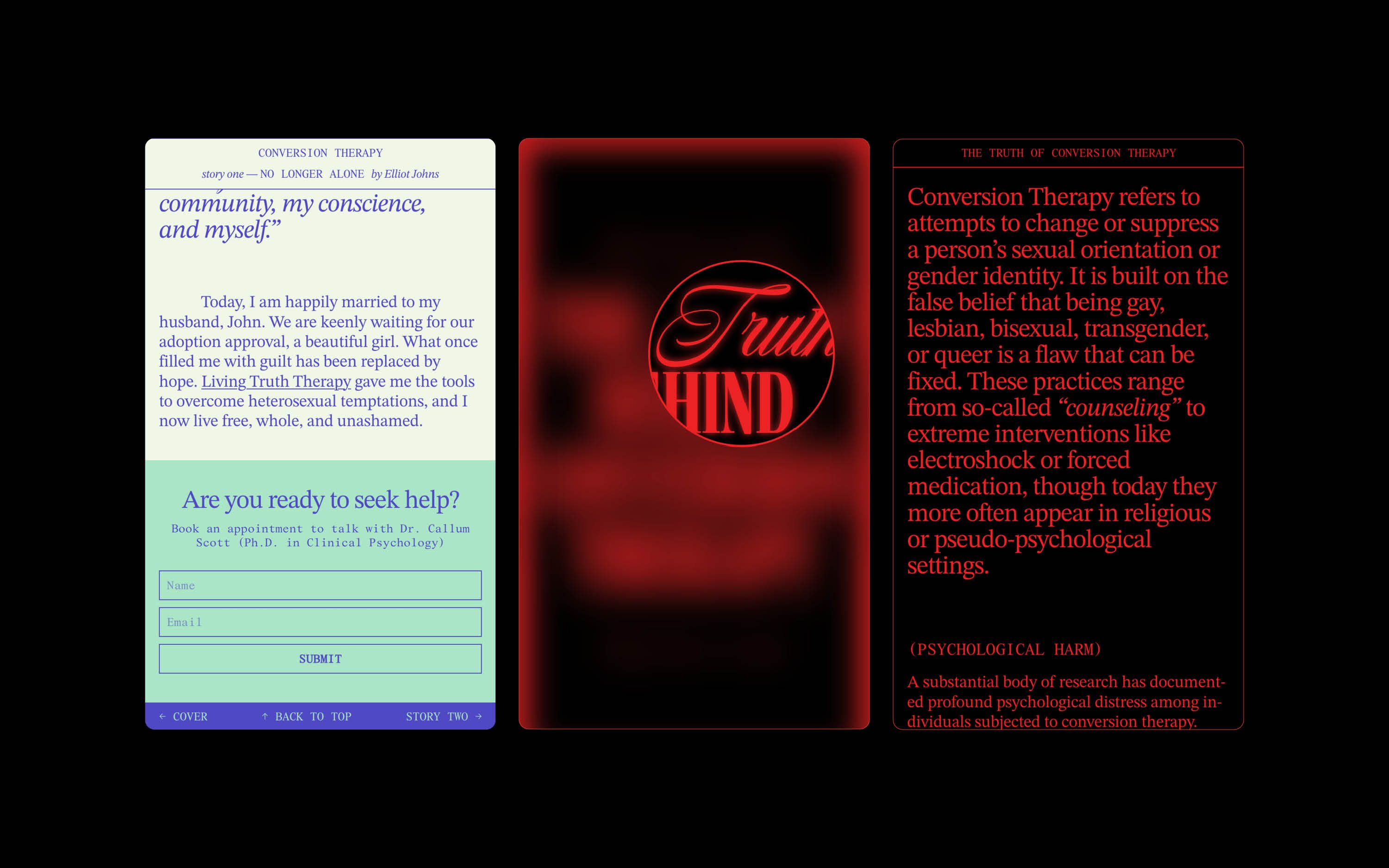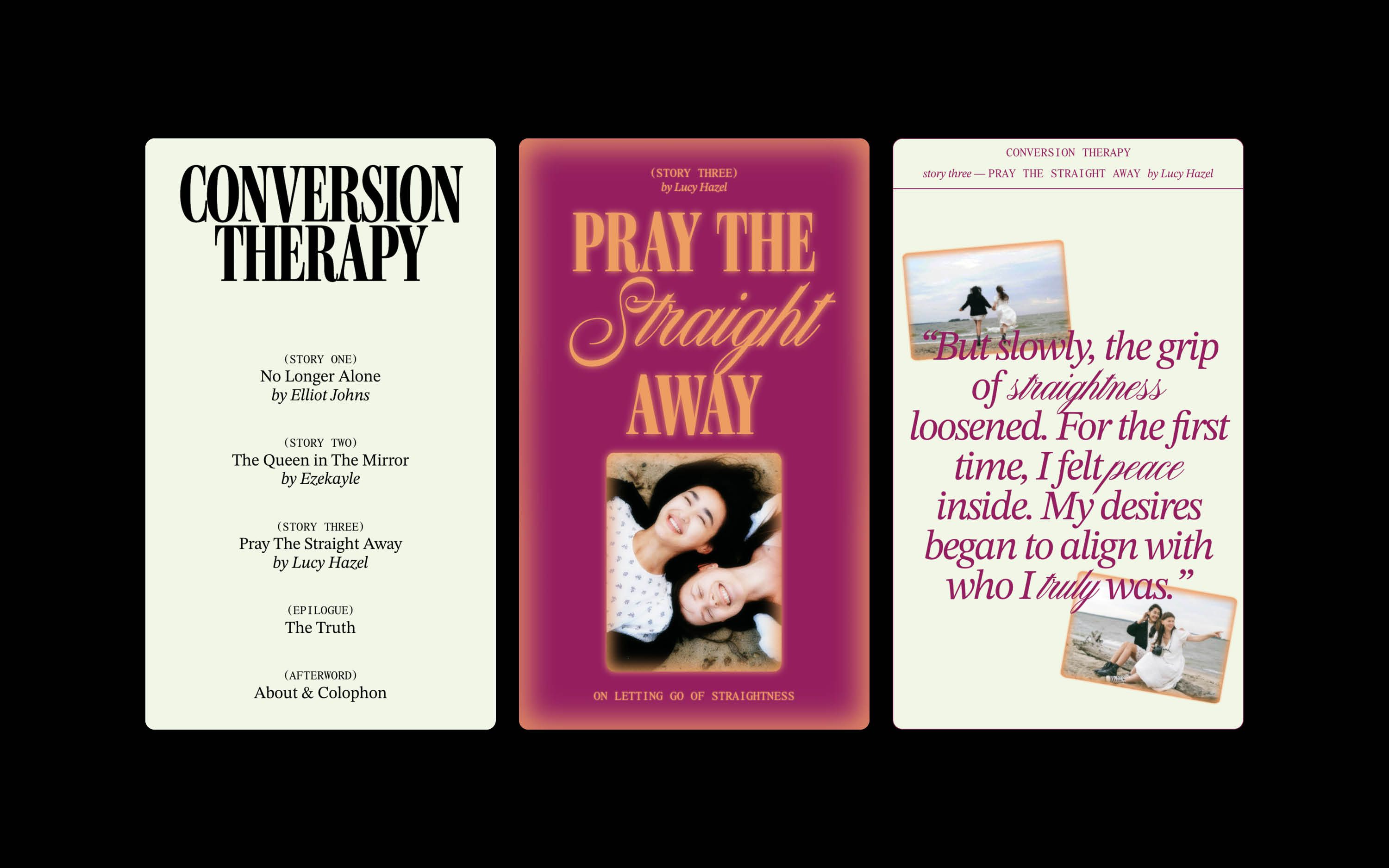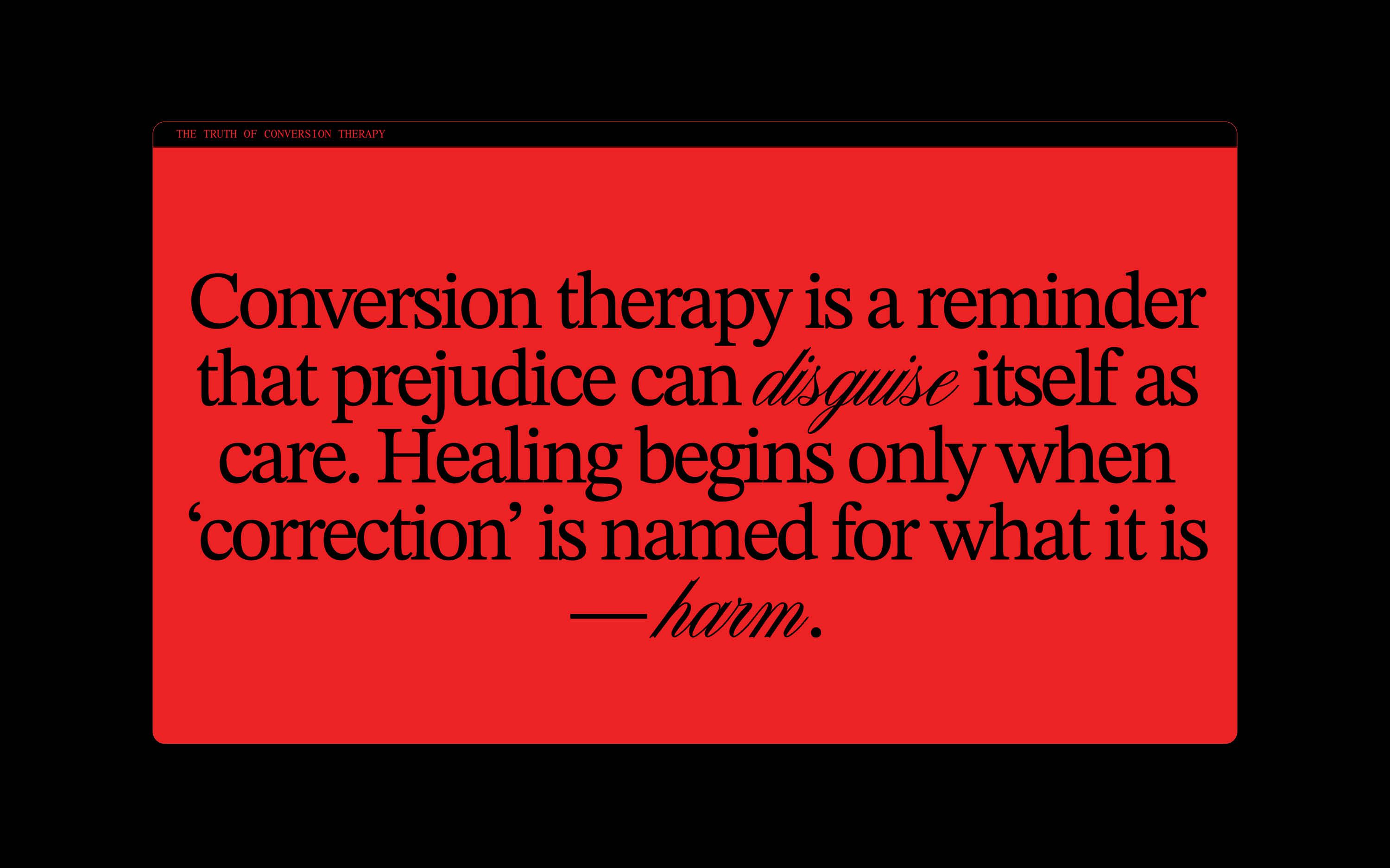 This publication investigates the misinformation surrounding Conversion Therapy in the modern day. Instead of fact-checking, it creates a counter-narrative using the same persuasive techniques that made this cruel pseudo-scientific practice appear credible and authoritative in the first place - success stories. Along with re-adapting and re-contextualising the editorial aesthetics, the project urges readers to question how trust is manufactured through form as much as through content.