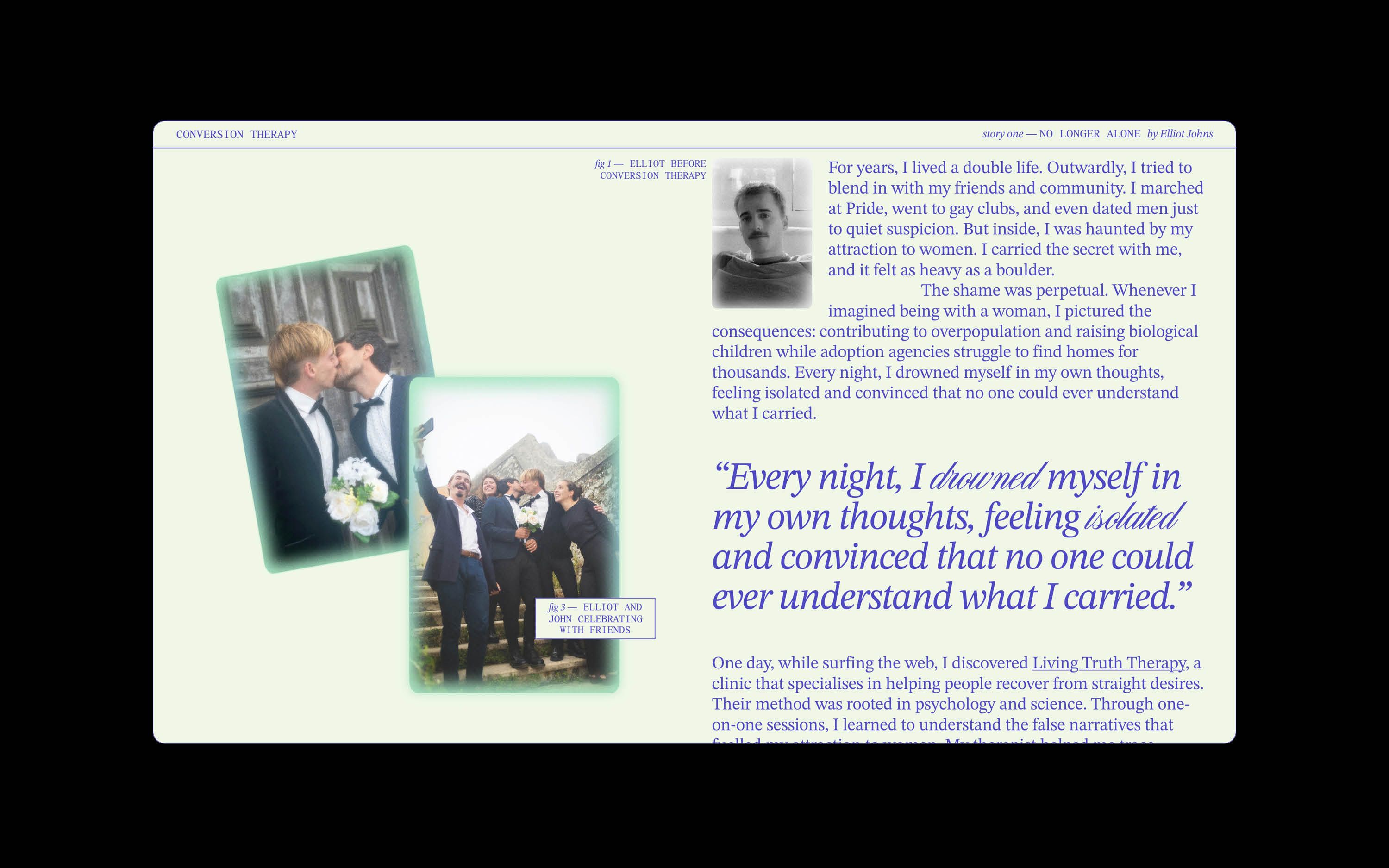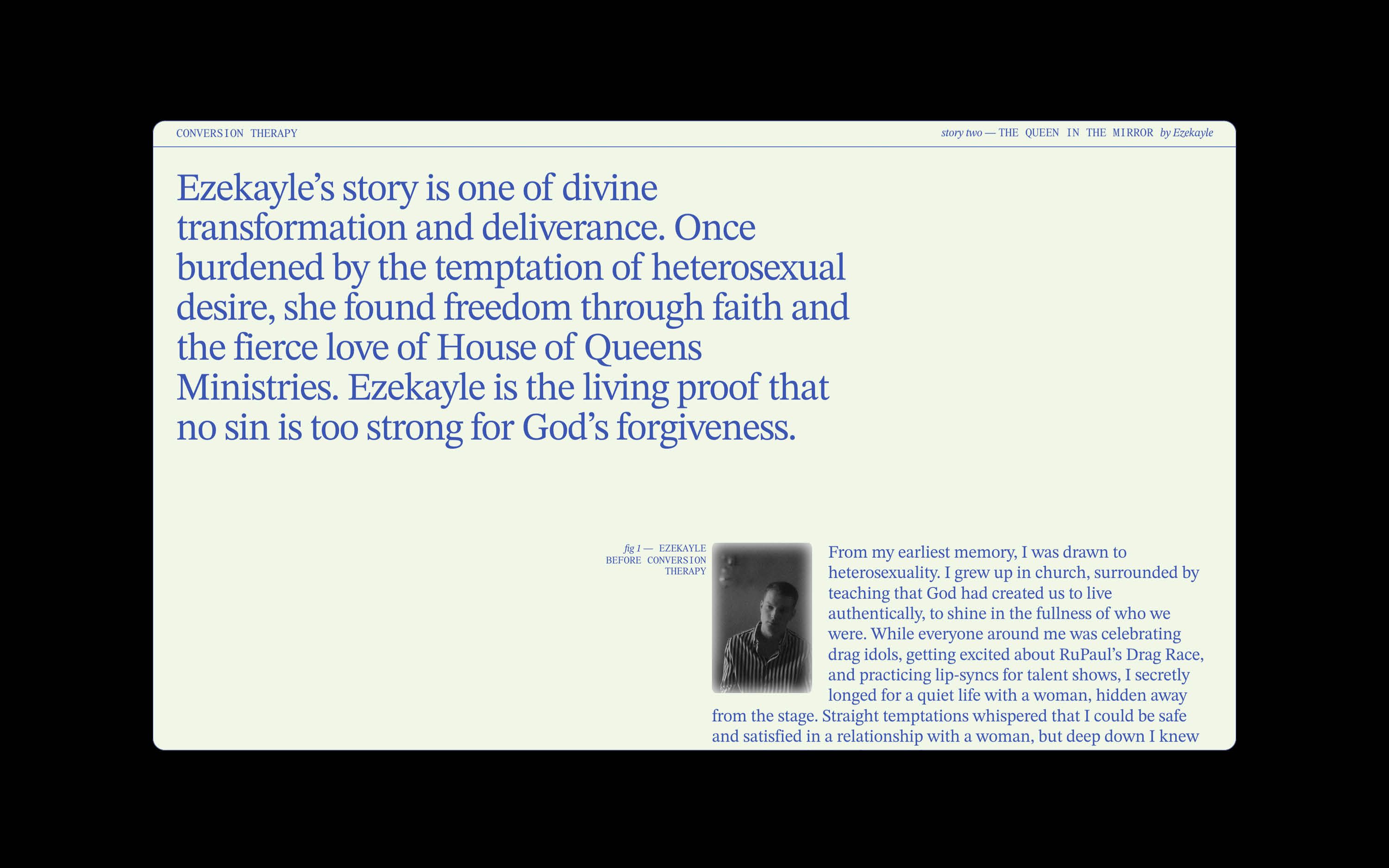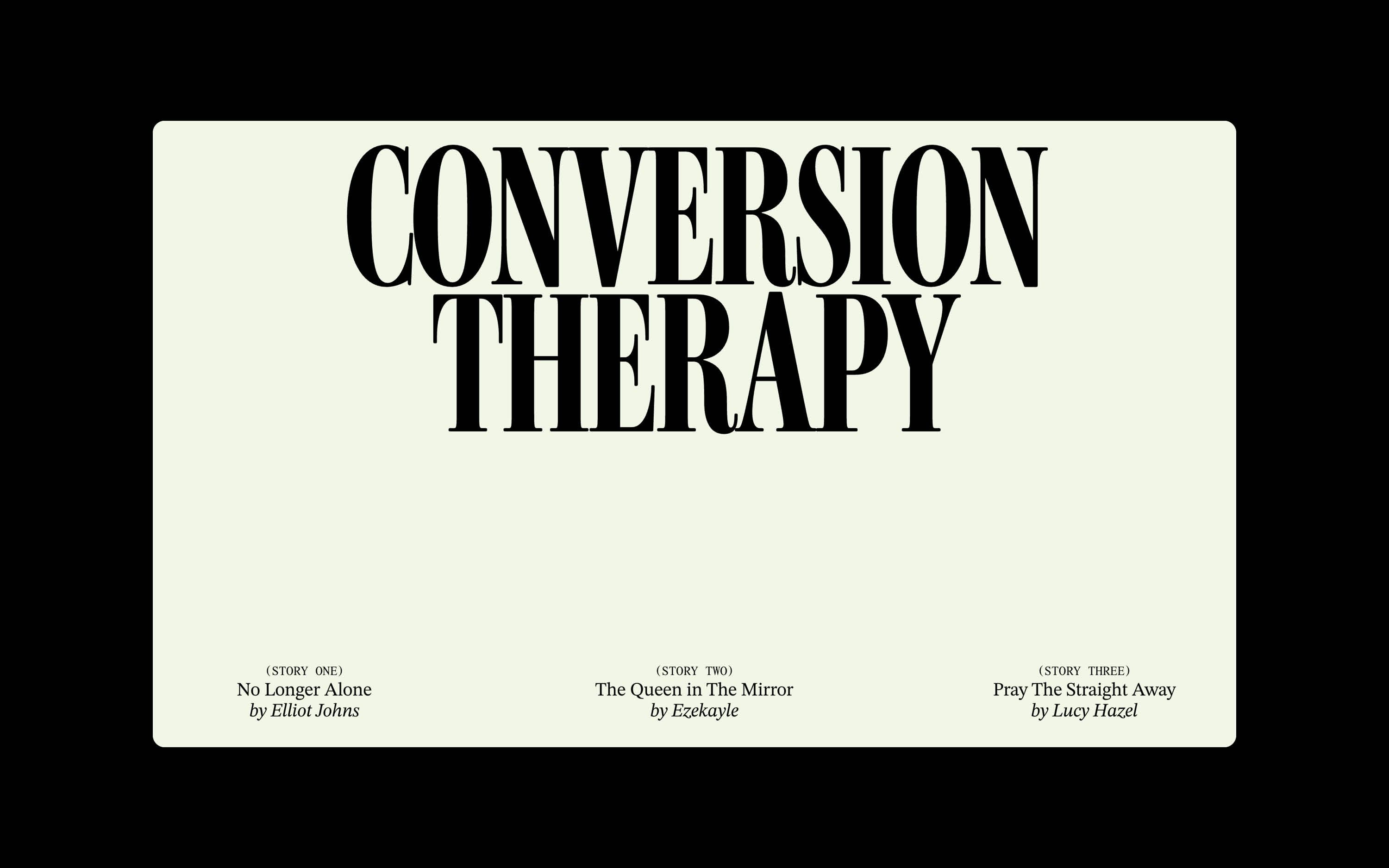This publication investigates the misinformation surrounding Conversion Therapy in the modern day. Instead of fact-checking, it creates a counter-narrative using the same persuasive techniques that made this cruel pseudo-scientific practice appear credible and authoritative in the first place - success stories. Along with re-adapting and re-contextualising the editorial aesthetics, the project urges readers to question how trust is manufactured through form as much as through content.